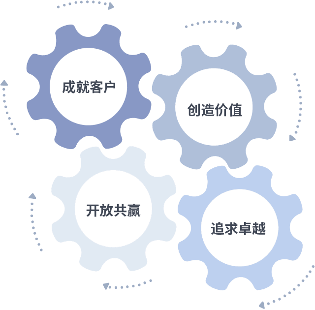 成就客户是一切决策的出发点,,,,创造价值是衡量所有工作的标准,,追求卓越是我们做事做人的态度,,开放共赢是我们的格局也是最终的结果。。。。价值观的齿轮环环相扣,,,推动着组织里的每个人不断向前。。。