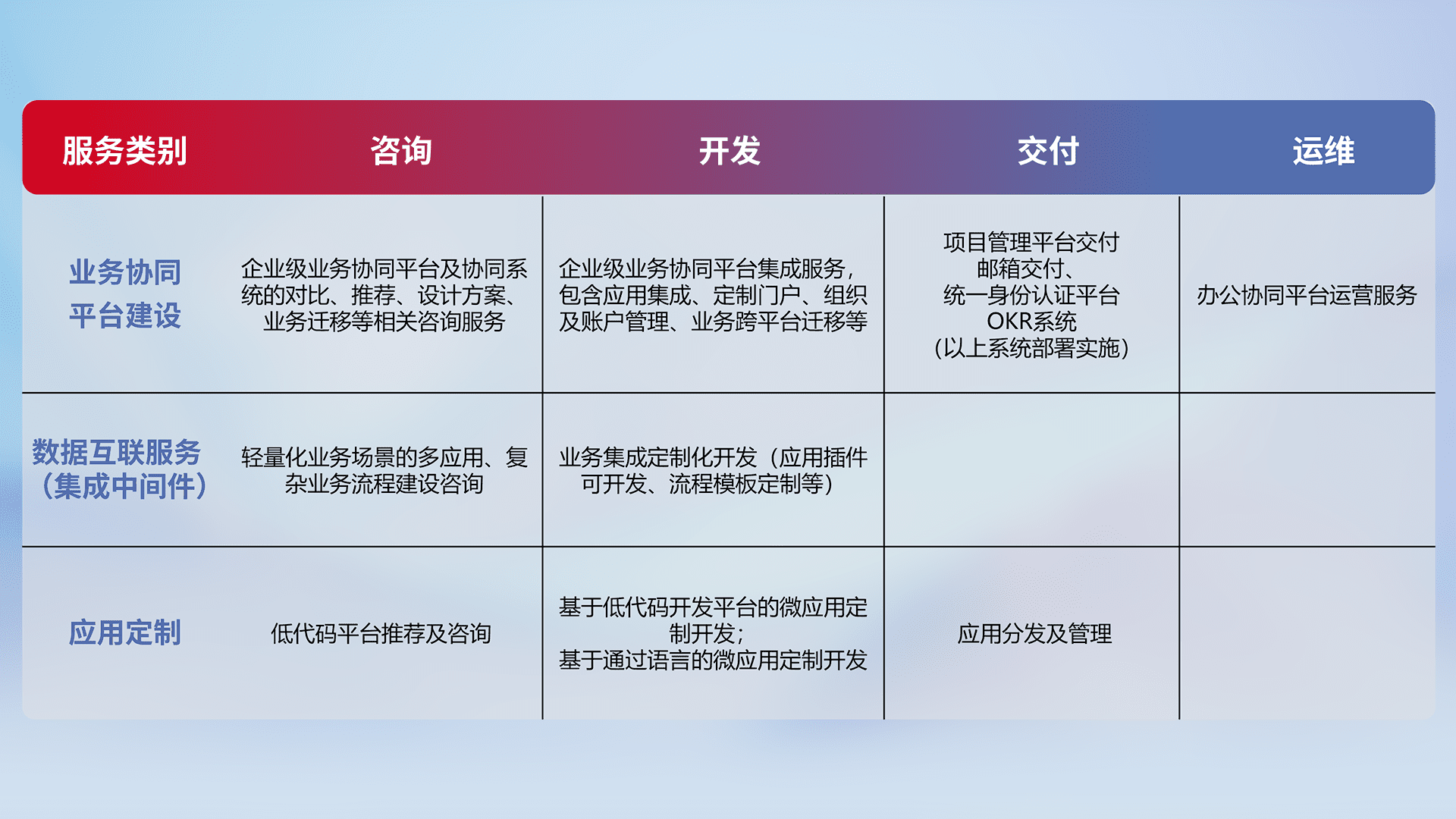 针对钉钉、、、、企微、、、、IDaas等平台级产品提供产品的规划、、方案、、、、交付、、定制化开发等服务,,,实现如统一协同办公、、、智能客户服务、、混合会议管理、、智能数据查询、、等业务场景,,实现数字化转型。。